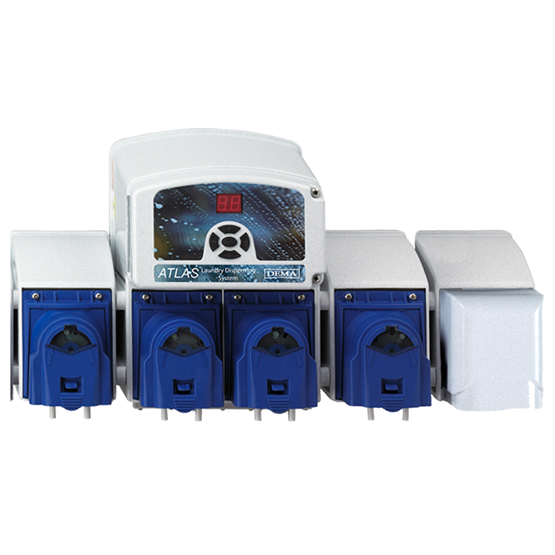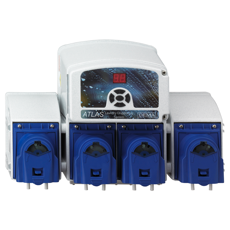 844P Atlas Premium OPL and Commercial Laundry System is the premium on-premise laundry system with a unique modular design that provides easy addition of up to 7 pumps for greater flexibility. Atlas can accommodate 2 different pump sizes to handle an array of machines, capacities and applications. Choose between the industry-proven standard Quick Change Blue Pump for 16 ounces (473 ml) per minute or the Large Blue QC Pump for 50 ounces (1479 ml) per minute. Atlas operation modes include auto formula-select, relay, sequence, and manual formula select.