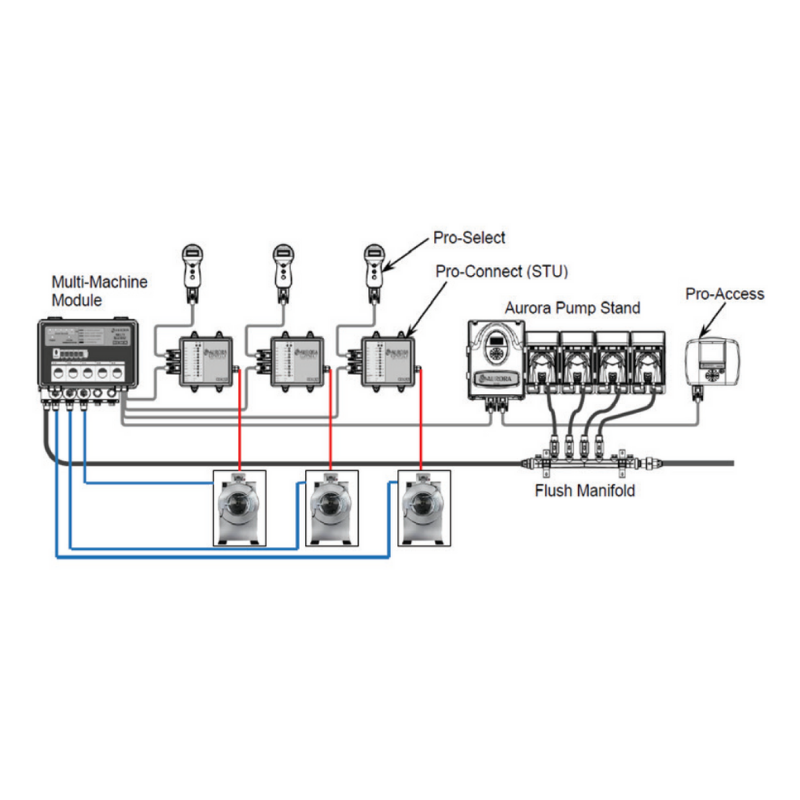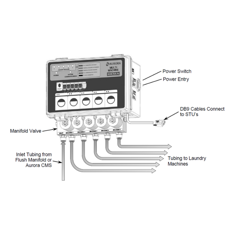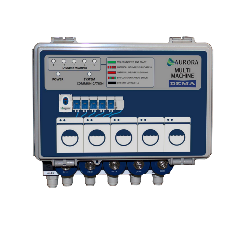 Aurora Multi-Machine expands the functionality of any Aurora Laundry System. The multi-machine system plugs into the Aurora dispenser and allows the single unit to support up to 5 laundry machines saving both cost and space.