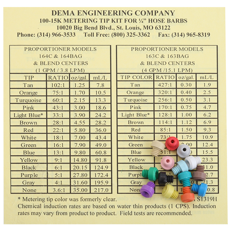 - For applications that require standard dilutions, DEMA offers a Metering Tip Kit for purchase, separate from your dispenser. The tip kit is DEMA # 100-15K and comes with 14 metering tips. Compatible with all DEMA action gap or air gap 1/4” metering elbow configuration.