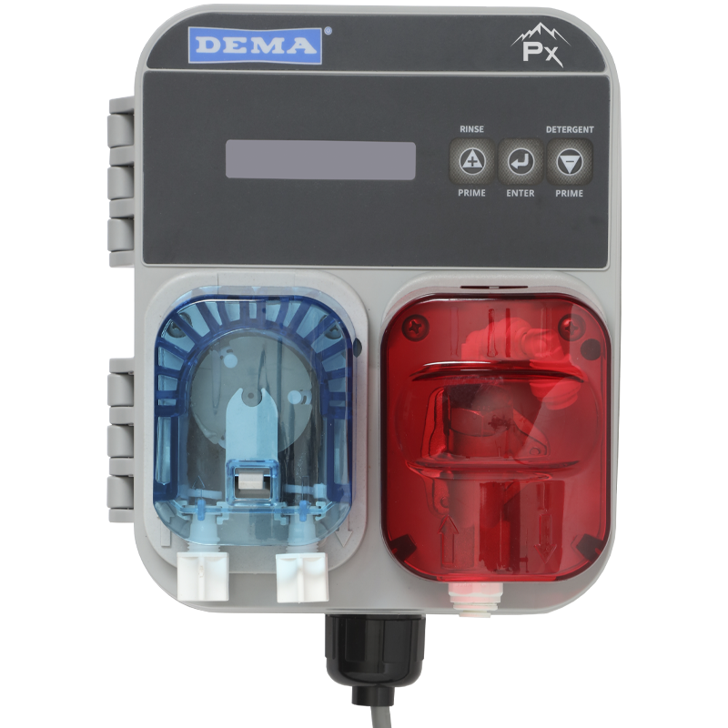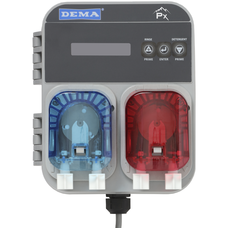 Px is the new economical probeless warewash dispenser from DEMA. With a simple to understand menu, the digital programming of Px is straightforward and easy to navigate. Px uses color coded pumps to easily identify between rinse and detergent products. It’s prewired and comes with a quick install mounting bracket with integrated bubble level. Px installation is a breeze and will have your new warewash installation up and running in no time!
