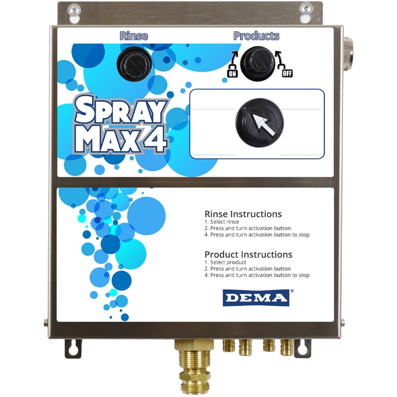 The Spray Max 4 is DEMA’s latest Multi-Product Spray and Cleaning System. It is a simple solution designed to streamline and dispense up to 4 different products. This system features push button valves with a venturi injector and selector. Spray Max 4 has been designed with ease of installation, use, and service in mind.